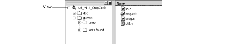 A view shows a directory tree of specific versions of source files. The view pat_v1.4_ cropcircle is a directory tree of source files for developing release 1.4 of the Cropcircle software product.