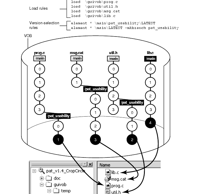 The versions to select in the development project's specific branch. As Figure 22 illustrates, some or all source files for the project have at least one version on the specified branch. If an element does not have a version on the specified branch, other rules in the config spec select a version of the element. In Figure 22, because lib.c does not have a version on the pat_usability branch, the view selects the version on the main branch.