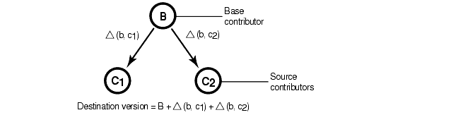 Figure 26 illustrates common cases of merging. If no merges have been performed in the element, the actual common ancestor (A) of the contributors (C) in the version tree is selected to be the base contributor.