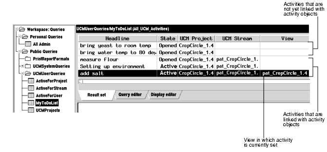 The MyToDoList query finds all UCM-enabled records that are assigned to you in ClearQuest, even if they have not been linked with activity objects or if they have been linked with activity objects in someone else's stream (Figure 14). For more information, see Queries and UCM-Enabled Record Types and ClearCase Activities.
