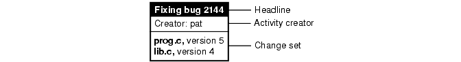 The ClearCase activity object includes a text headline, which describes the task, the user ID of the activity creator, and a change set, which identifies all versions that you create or modify while working on the task (Figure 2).