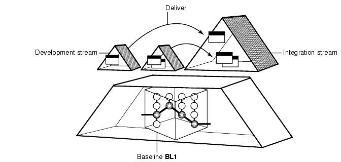 Integrators incorporate the work delivered to parent streams into new baselines. If the parent stream is the project integration stream, the baseline applies to the child development streams of the integration stream (Figure 7).