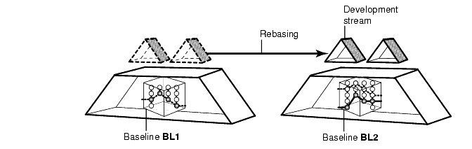 You update your development work area with a new baseline by performing a rebase operation. This operation merges files and directories from the parent stream to your development stream and allows you to see the new work identified by the recommended baselines. After rebasing, a development work area shows the versions specified by the baseline, plus any of your undelivered activities (Figure 8.)